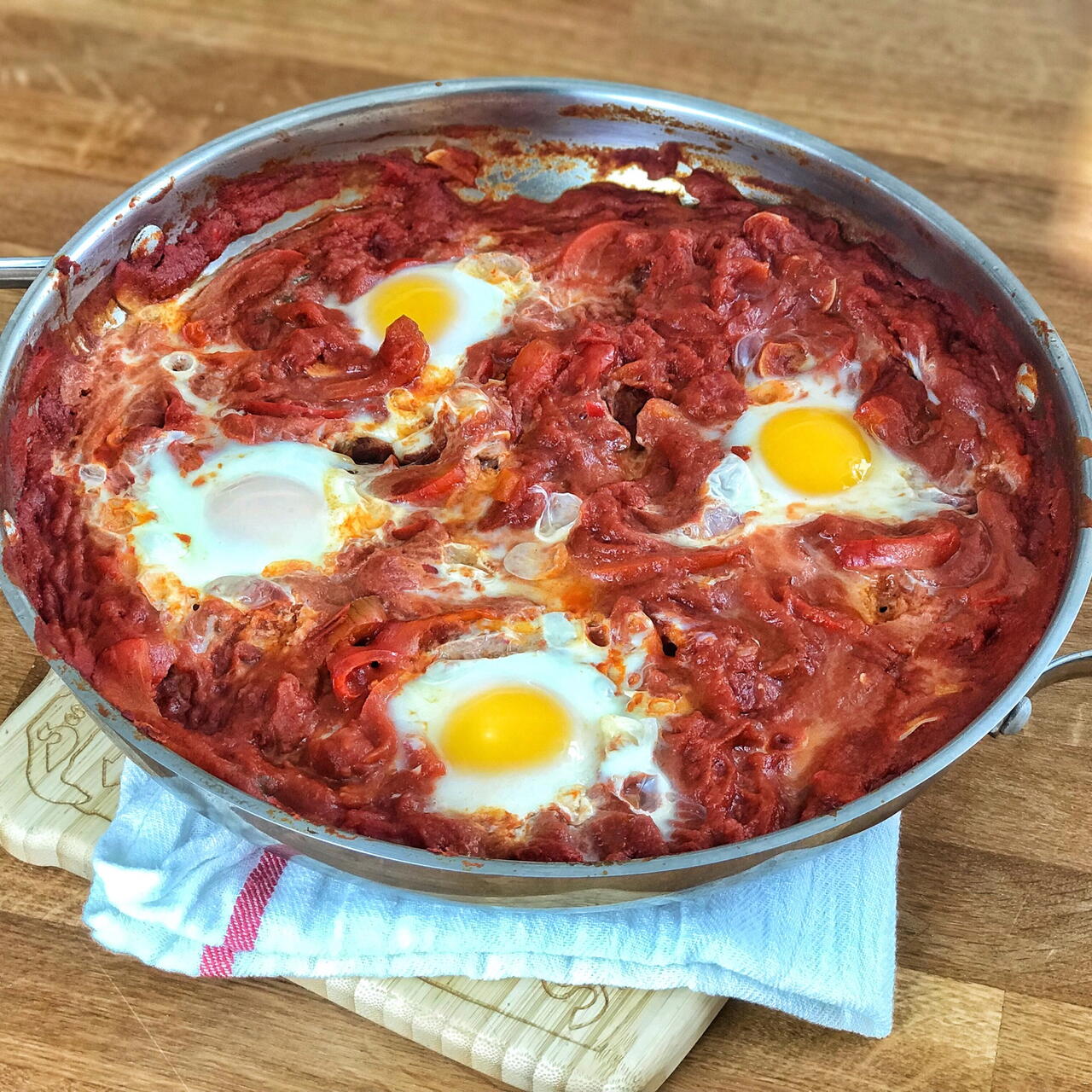 Rezept für ein sehr leckeres shakshuka mit viel geschmorter paprika,.